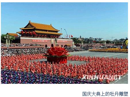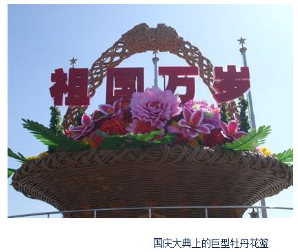 举国欢庆的建国60周年大庆典上,天安门广场摆放一个超大近10高的花篮,花篮以牡丹为主要元素,此花篮位置红旗杆后方10左右,位置最佳,雍容华贵,尽显国花牡丹风采,令无数人驻足留恋拍照欣赏,河南牡丹花车在广场西侧10距离,很多人一到牡丹花车面前都齐喊牡丹真漂亮。牡丹是中国最具知名度的传统名花,也是世界名花。牡丹以其妩媚多姿的花容、端庄雍容的神韵、富贵吉祥的寓意,一直深爱人们的喜爱。牡丹――花之富贵者也;以牡丹象征富贵。牡丹花朵硕大,色泽鲜艳。是繁荣昌盛、和平幸福的象征。自古以来有“花中之王”、“国色天香”、“富贵花”的美誉,能在国庆大典上有如此风采,充分体现出牡丹在中国的地位之高。